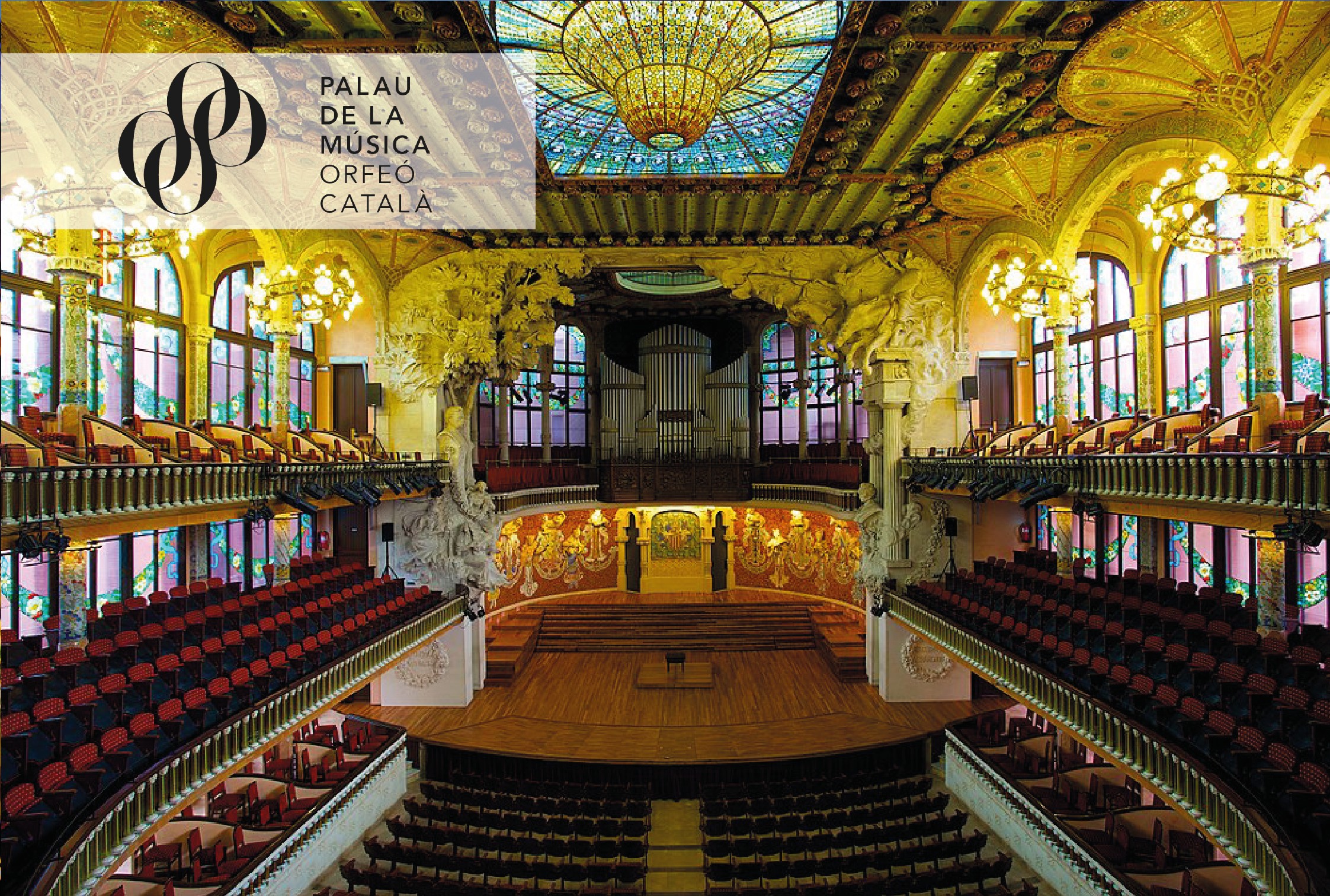 A continuación, admirarás la Sala Lluís Millet y la Sala de Conciertos. Dos estancias con fuerte simbología modernista, inspirada en detalles de la naturaleza como las columnas de temática floral y todo el decorado repleto de luz y color a través de sus grandes vidrieras. Gracias a la visita se accede, además, al segundo piso, donde puedes admirar el lucernario, inspirado en el sol y que ilumina toda la estancia, una caja de música que te atrapará, presidida por el gran órgano del Palau quién pone fin a la visita con una breve interpretación musical.